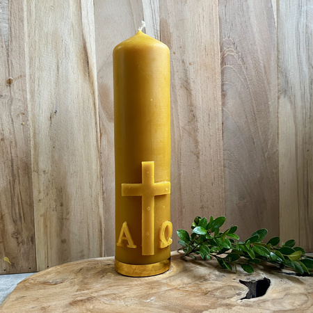 Duży walec z wosku pszczelego z wytłoczonym krzyżem oraz literami alfa i omega.